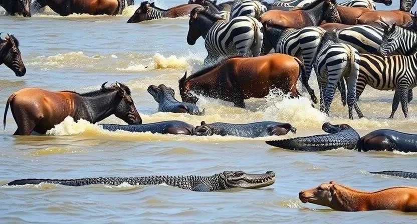 Пересечение рек Мара и Грумети – это один из самых драматичных и опасных моментов миграции. Крокодилы подстерегают животных в воде, а львы, леопарды и гиены нападают на них на берегу. Животные вынуждены преодолевать сильное течение, острые камни и хищников, чтобы добраться до другой стороны. Многие гну и зебры погибают во время переправ, но те, кто выживает, получают доступ к свежим пастбищам. Это настоящая борьба за выживание, демонстрирующая силу и жестокость дикой природы.