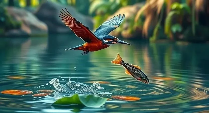 - Захват добычи: Рыба захватывается клювом и крепко удерживается. Зимородок редко промахивается.