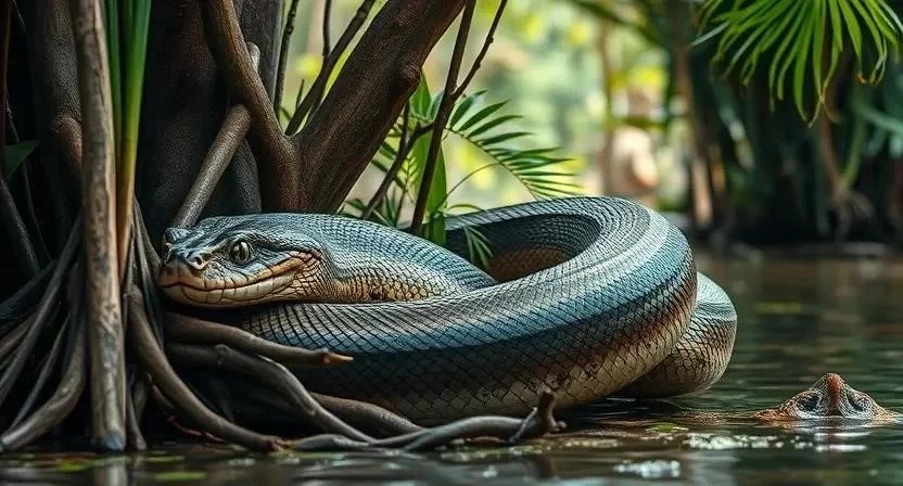Анаконда – это крупная неядовитая змея, обитающая в реках и болотах Южной Америки. Анаконды охотятся на крупных животных, таких как капибары, кайманы и олени, сжимая их своим мощным телом. Они предпочитают влажные места обитания и проводят большую часть времени в воде.
