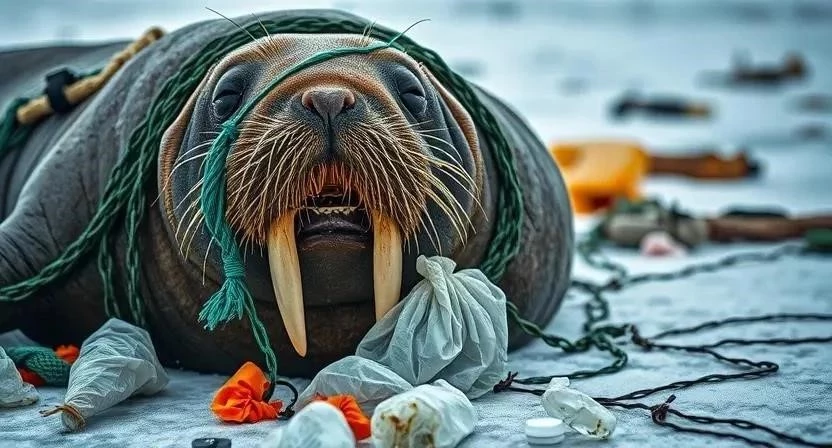 Моржи часто проглатывают пластик, принимая его за пищу. Это может привести к закупорке пищеварительного тракта, голоданию и смерти. Моржи также могут запутываться в пластиковых отходах, таких как рыболовные сети и пластиковые пакеты. Запутывание может привести к травмам, утоплению и гибели. Микропластик, образующийся при разрушении крупных пластиковых предметов, также представляет опасность для моржей. Микропластик накапливается в тканях моржей, оказывая токсическое воздействие на их здоровье.