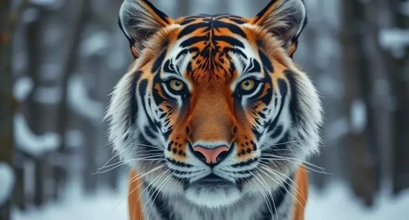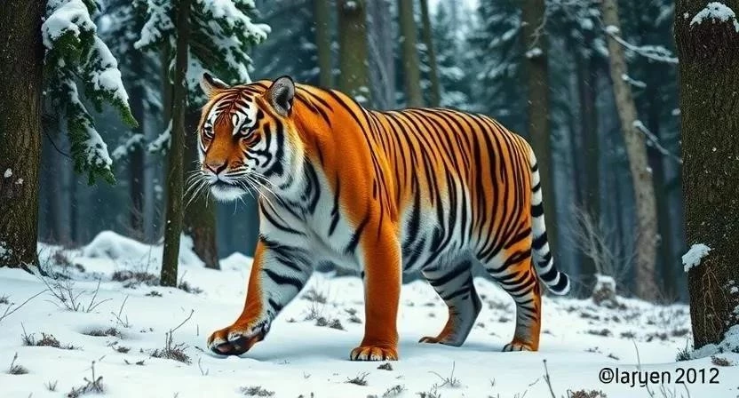 Амурский тигр – это мощный и грациозный хищник. Его размеры впечатляют: самцы могут достигать длины тела 3,3 метра и весить до 300 кг, а самки немного меньше – до 2,75 метра и 180 кг. Окрас шерсти варьируется от ярко-рыжего до оранжевого, с черными полосами, которые уникальны для каждого тигра, как отпечатки пальцев у человека. Зимой шерсть становится более густой и светлой, что помогает тигру маскироваться в снежных лесах. У амурского тигра широкие лапы, которые позволяют ему легко передвигаться по глубокому снегу, и мощные челюсти, способные с легкостью сломать кости жертвы.