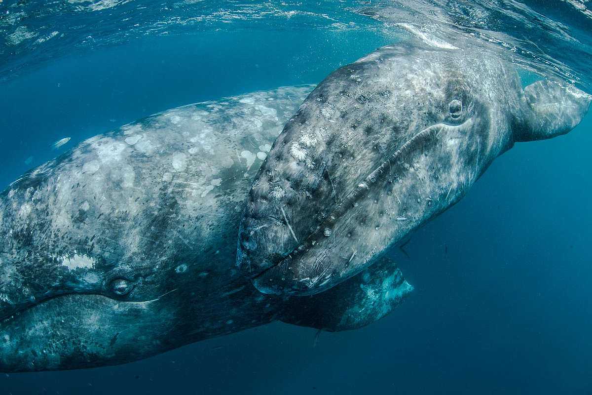 Длина серого кита в среднем составляет 15 метров, а масса достигает 35 тонн. Вместо спинного плавника располагается горб. Размер головы серого кита занимает пятую часть от всей длины тела.