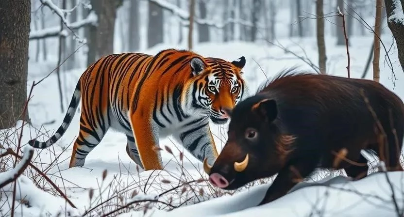 Амурский тигр – хищник, который питается в основном копытными животными, такими как изюбрь, кабан, косуля и лось. Тигр охотится из засады, подкрадываясь к добыче как можно ближе. Он обладает мощными челюстями и острыми когтями, которые позволяют ему быстро и эффективно убивать жертву. В рацион тигра также могут входить зайцы, птицы и рыба. Сезонные изменения в питании связаны с доступностью различных видов добычи. Тигр конкурирует с другими хищниками, такими как медведь и волк, за пищу. Я читал, что тигры могут проходить большие расстояния в поисках добычи, особенно в зимний период.