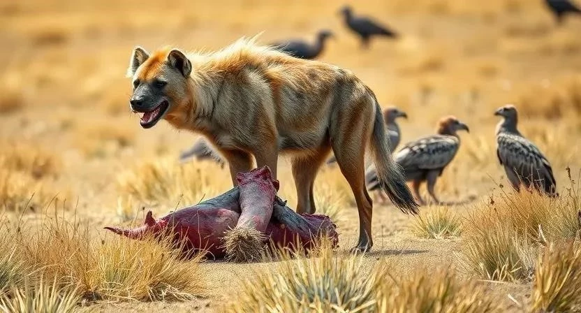 | Полосатая гиена | Травоядные (антилопы, зайцы) | Падаль, насекомые, фрукты | Всеядность, приспособленность к различным источникам пищи |