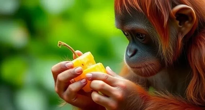 Орангутаны – всеядные животные, но основу их рациона составляют фрукты. Они также питаются листьями, корой, насекомыми, медом и иногда яйцами птиц. Орангутаны используют свои длинные руки и пальцы, чтобы доставать пищу из труднодоступных мест. Они также известны своим умением использовать инструменты, например, палки для извлечения термитов из термитников.