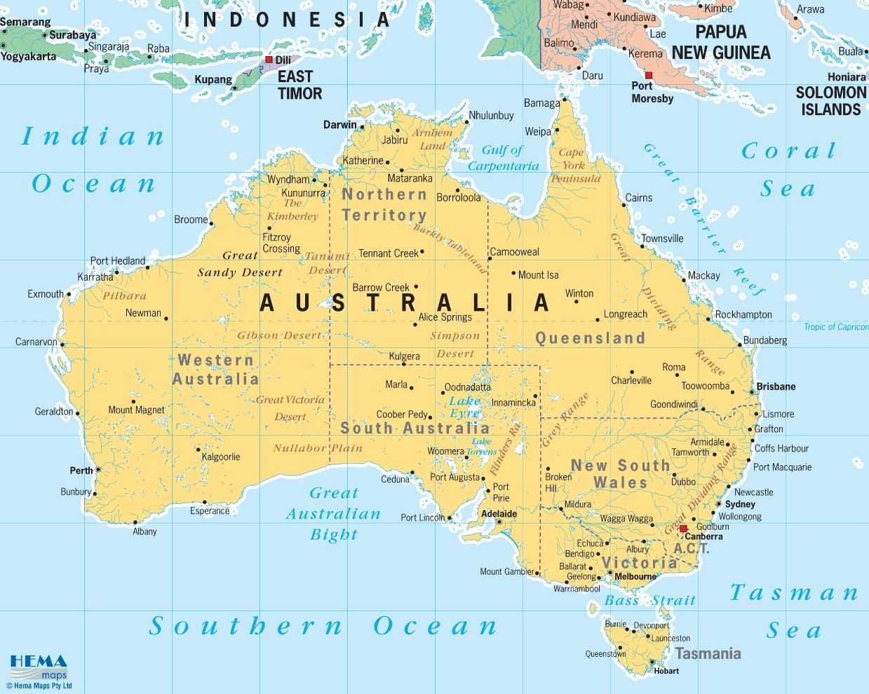 Австралия является самым маленьким материком мира и вторым наименее населенным. Она расположена в Океании между Индийским и Тихим океанами. Хотя это большая страна, ее топография не слишком разнообразна, и большая часть состоит из пустыни. Есть, однако, плодородные равнины на юго-востоке.