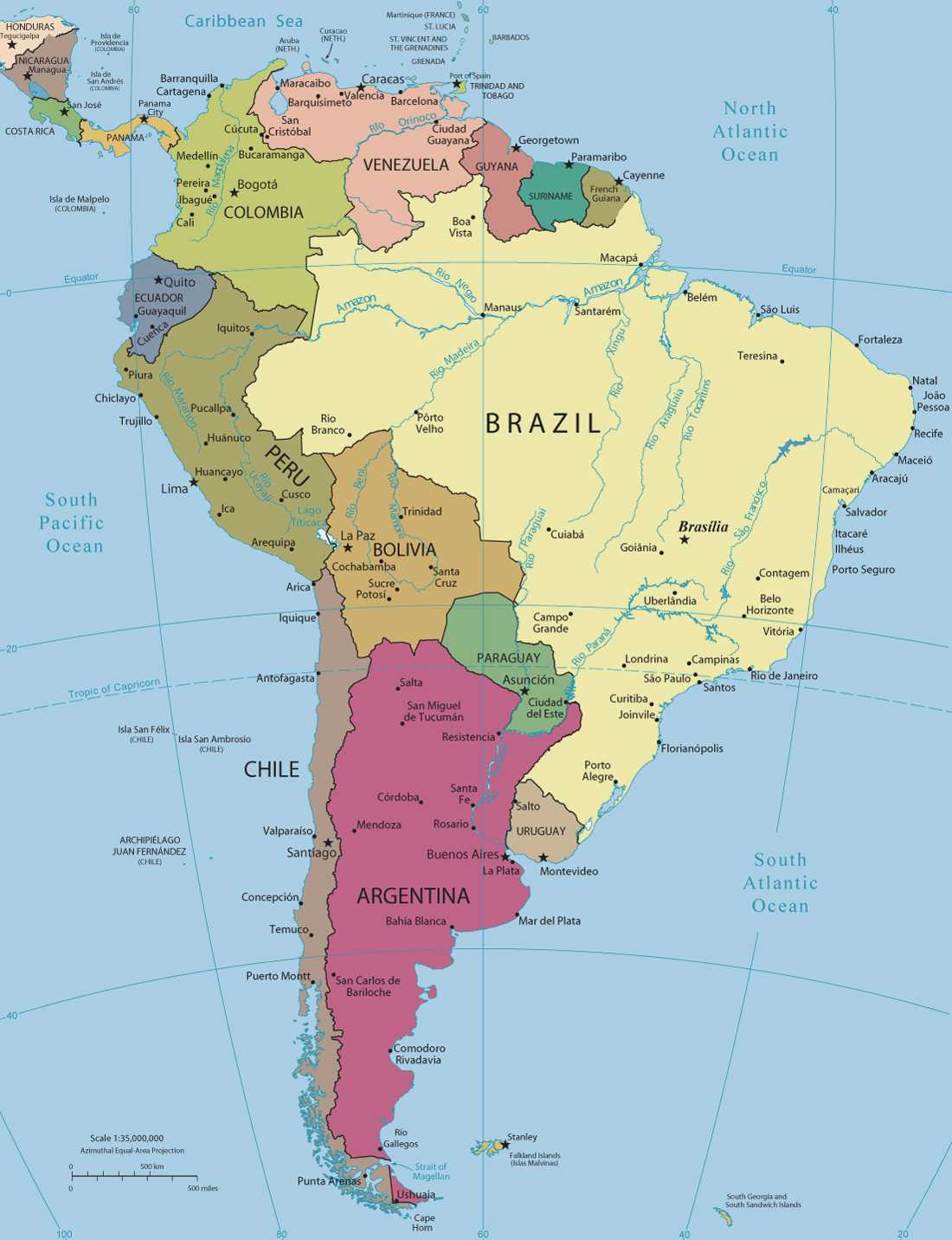 По размерам, южная Америка занимает 4-е место среди материков, население — около 400 млн.