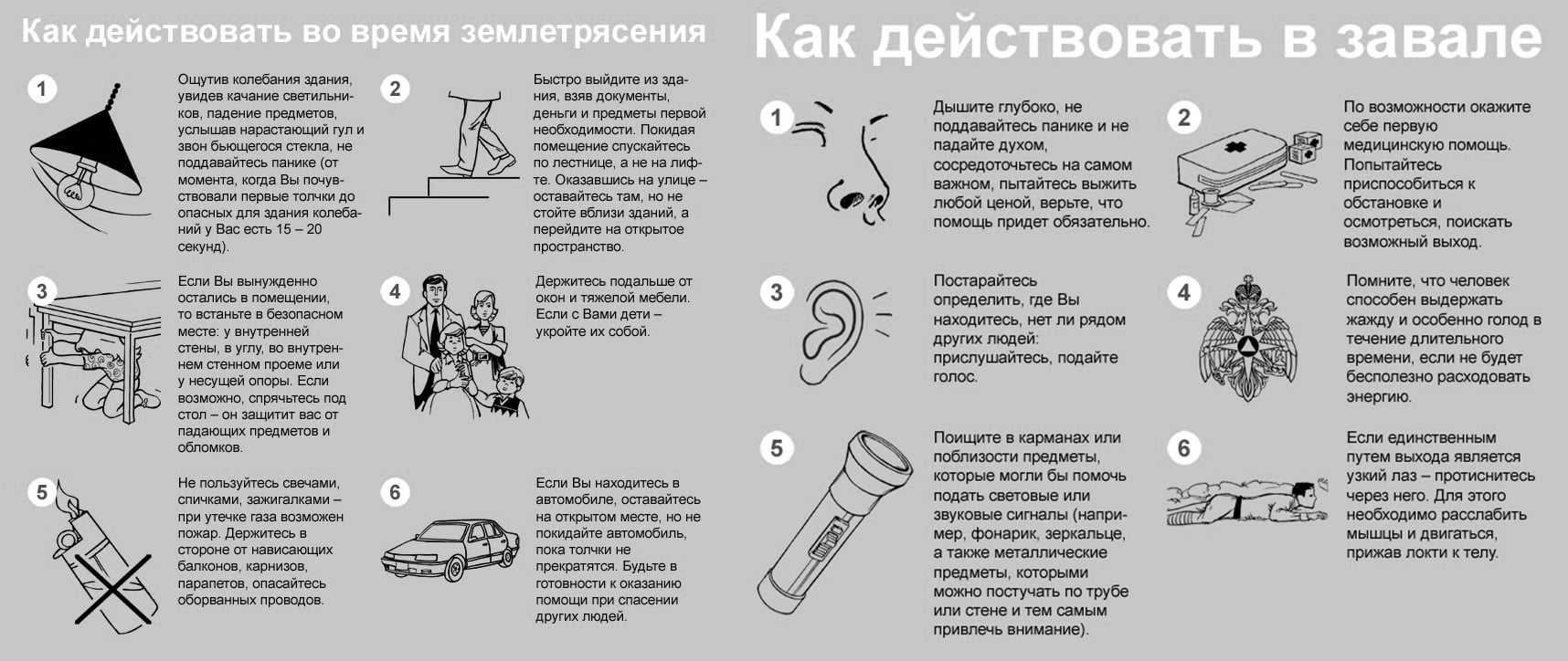 Оказавшись в завале, необходимо любыми способами дождаться помощи, которая обязательно прибудет. Пошевелите пальцами ног, попробуйте сдвинуться, это поможет вам оценить собственные травмы (если они есть) и определиться с наличием свободного пространства. Сильно не расходуйте кислород. Дышите ровно. Если есть действующий фонарик, осмотритесь