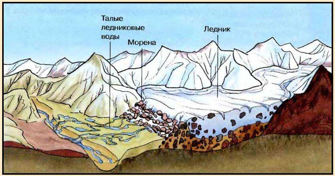 Ледники передвигаются с небольшой и непостоянной скоростью, равной десятку и первой сотне метров в год. У крупнейших ледников Гренландии скорость достигает 5-40 м в сутки, в Гималаях не больше 1200 м в год, в других горных системах 40-100 м в год. На границу хионосферы (распространение ледников) влияет климат. При отступлении ледников поверхность долин покрывается конечными моренами, а ее борта – отложениями боковых морен. Доказательством пребывания ледника служит U-образный контур долин. По оттаивании ледников участок поднимается, и снова появившиеся ледники будут заглублять долину, создавая ледниковые террасы.