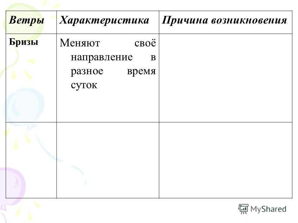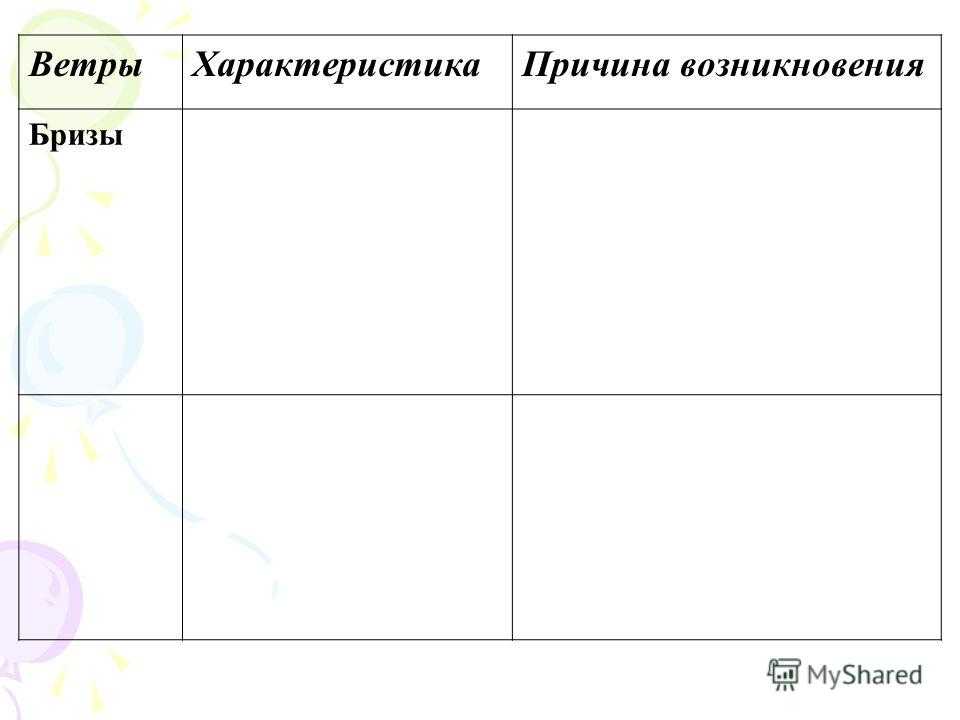 ВетрыХарактеристикаПричина возникновения Бризы Меняют своё направление в разное время суток