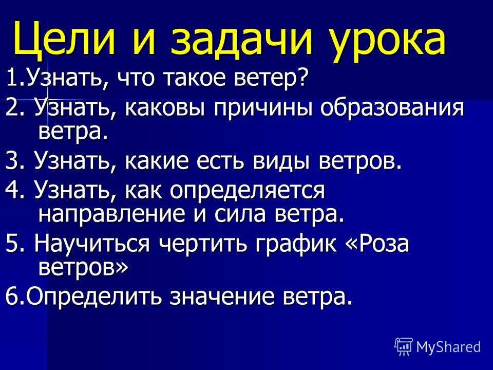 Презентация на тему: » Цели и задачи урока 1.Узнать, что такое ветер? 2. Узнать, каковы причины образования ветра. 3. Узнать, какие есть виды ветров. 4. Узнать, как определяется.» — Транскрипт: