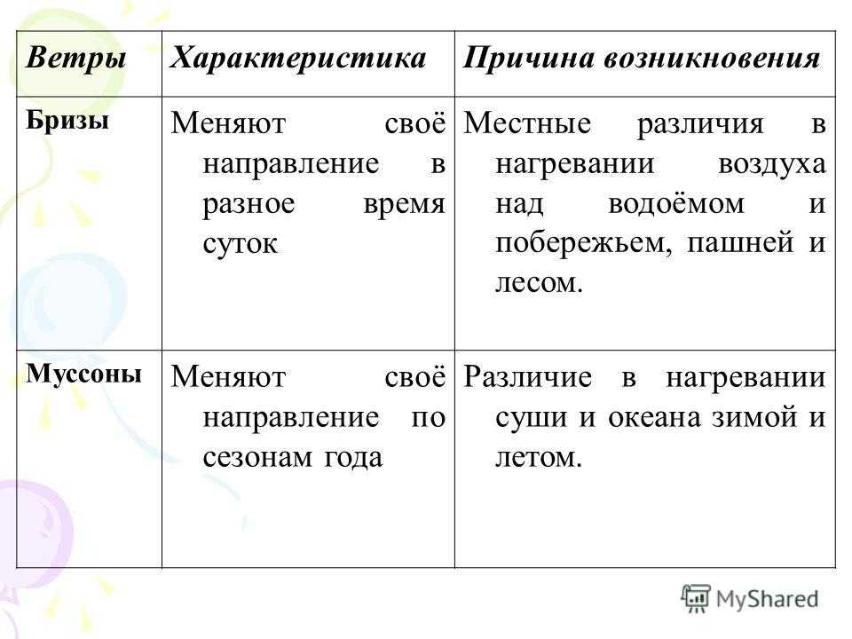 ВетрыХарактеристикаПричина возникновения Бризы Меняют своё направление в разное время суток Местные различия в нагревании воздуха над водоёмом и побережьем, пашней и лесом. Муссоны Меняют своё направление по сезонам года Различие в нагревании суши и океана зимой и летом.