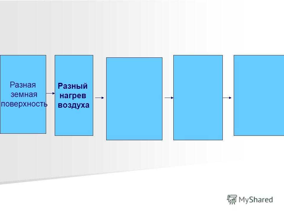Разная земная поверхность Разный нагрев воздуха Разная температура воздуха над ней Области с разным атмосфер- ным давлением Образование ветра