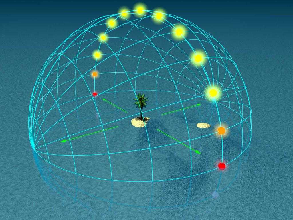 – динамика солнца. Световой день или динамика солнца мало изменяется за весь год. В зоне экватора солнце находится над территорией 12 часов, при этом максимальная высота равна 90 градусов над уровнем горизонта. В июне и июле длина светового дня постепенно увеличивается на 1-2 часа при движении на север и уменьшается на такое же время в период с декабря до января. Для Южного полушария все происходит наоборот. Самые длинные дни в году приходятся на декабрь и январь, а самые короткие бывают в начале и середине лета.