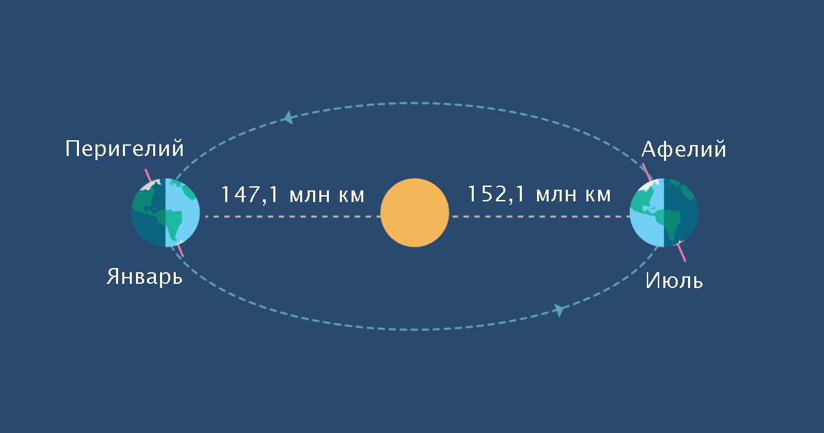 Наша планета вращается вокруг Солнца, но нельзя сказать, что она всё время вращается вокруг звезды на одном и том же расстоянии. Периодически, каждые полгода, планета то находится на минимальном расстоянии от Солнца, в перигелии, то отдаляется от светила еще на 5 млн км, и занимает максимально отдаленную позицию – афелий.