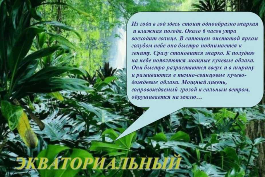 Субэкваториальный пояс состоит из нескольких природных зон. Они отличаются климатическими условиями, растительным и животным миром: