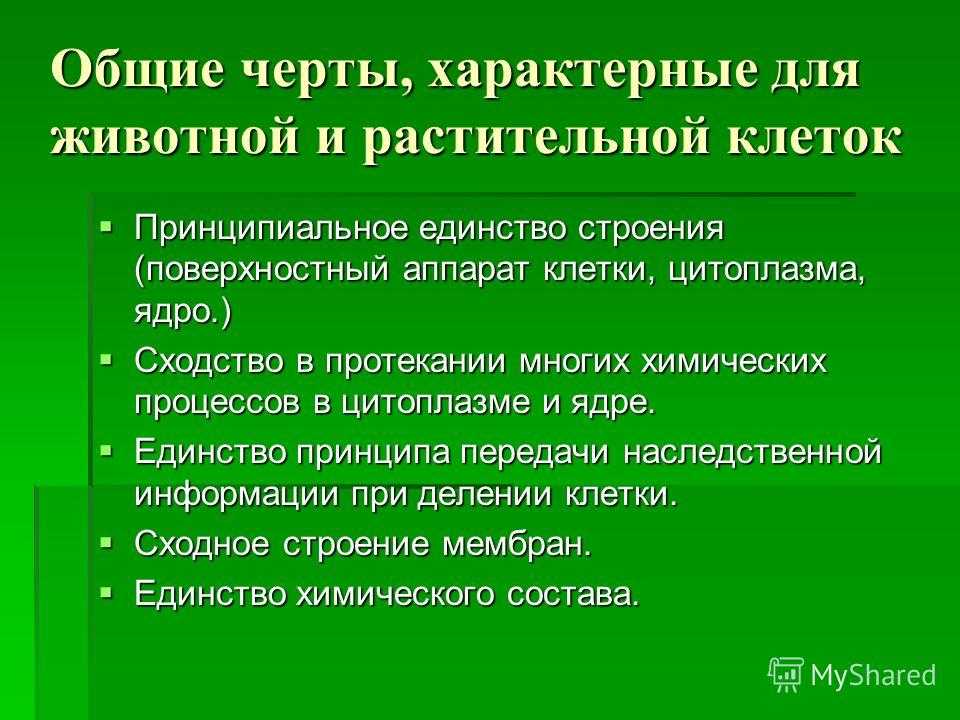 - Принципиальное сходство в особенностях строения и молекулярного состава клеток растений и животных указывает на родство и единство их происхождения, вероятнее всего, от одноклеточных водных организмов.