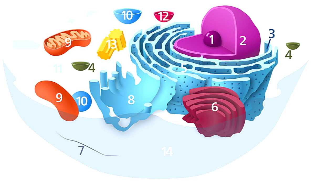 Компоненты типичной животной клетки:1. Ядрышко2. Ядрo3. Рибосома (точки в составе 5)4. Везикула5. Грубый эндоплазматический ретикулум6. Аппарат Гольджи (или тело Гольджи)7. Цитоскелет8. Гладкий эндоплазматический ретикулум9. Митохондрия10. Вакуоль11. Цитозоль (жидкость, содержащая органеллы; с которой состоит цитоплазма)12. Лизосома13. Центросома14. Клеточная мембрана