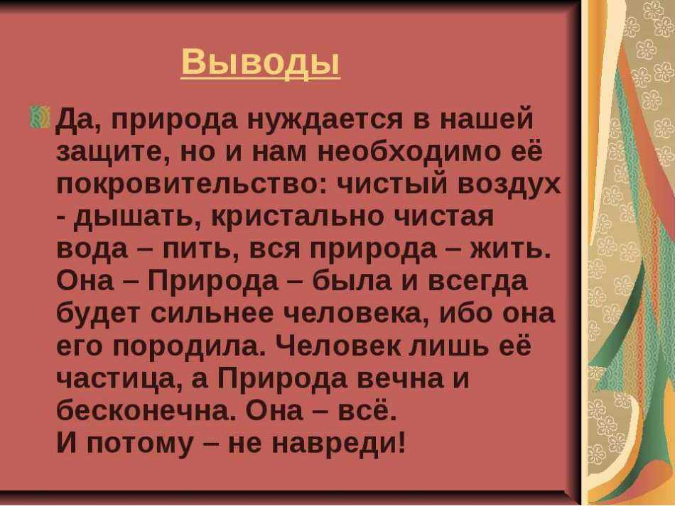 - Лозунг «Человек — царь природы» в корне не верен. Мы – неотъемлемая, но далеко не доминирующая часть природы, к которой, к огромному сожалению, мы относимся зачастую не просто потребительски, а преступно, не задумываясь о последствиях своих же действий.