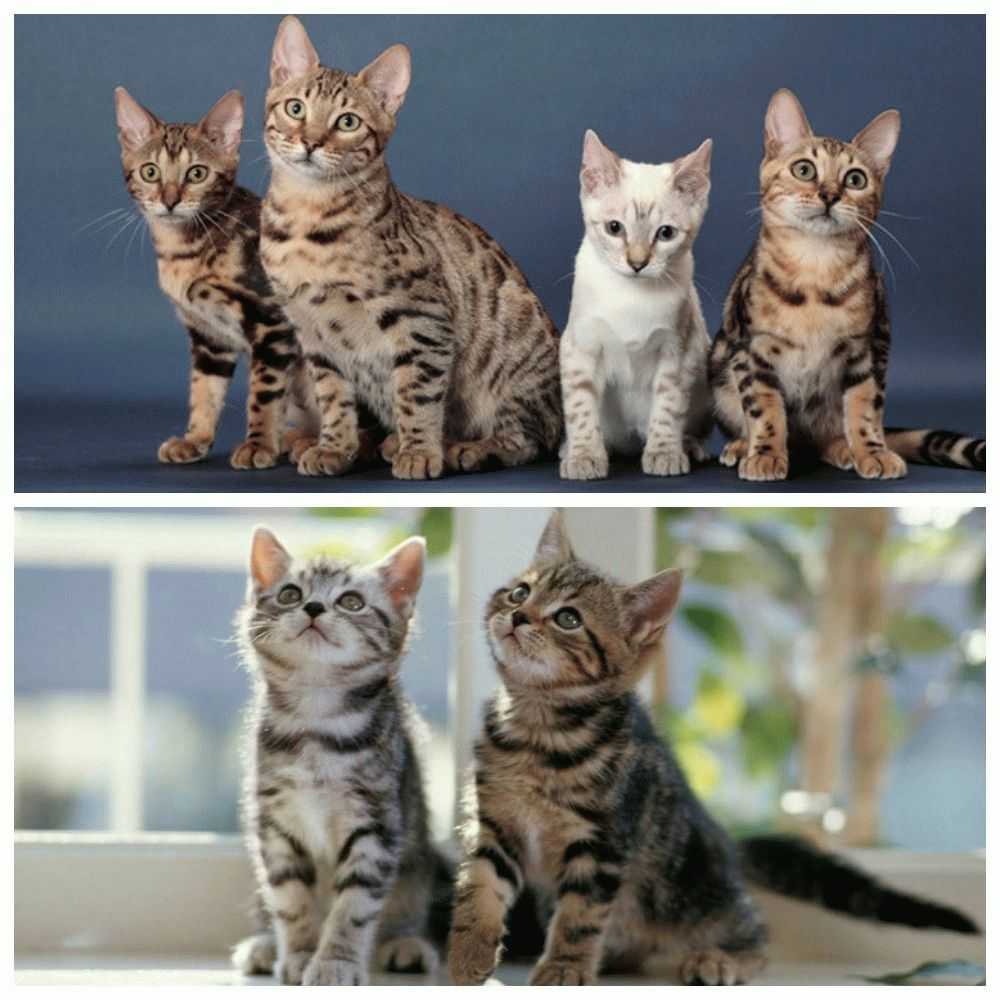 - Форма головы и окрас шерстяного покрова. Есть разновидности, которых никогда ни с кем не перепутаешь из-за своеобразного строения черепа. Например, у Ориентала он узкий и вытянутый, а у Экзота почти прямоугольный со скругленными краями и оригинальным приплюснутым носом. Дикий пятнистый окрас Бенгала существенно отличается от рисунка колор-пойнта Сиамца.