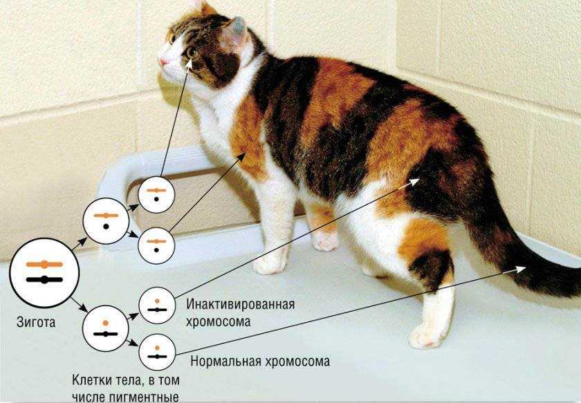 Известно, что кошки имеют пару Х-хромосом (ХХY), а коты Х и Y-хромосомы (XY). Первая из них отвечает за появление в окрасе животного чёрного (пигмент эумеланин) и рыжего цвета (пигмент феомеланин), белый кодируется другой хромосомой. Благодаря наличию двух Х-хромосом у кошек можно наблюдать одновременное появление чёрного и рыжего окраса на белом фоне.