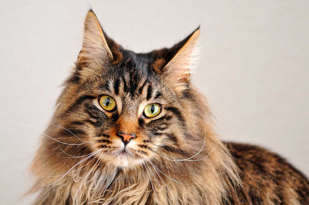 Это самые крупные кошки в мире. Знаменитые саванны им уступают в габаритах. Взрослый мейн-кун может весить до 15 кг и в длину достигать 1,23 м. Порода была выведена на американских фермах, в штате Мэн. Отсюда и первая часть названия. Приставку «coon» (англ. «енот») представители этой породы получили за пушистый полосатый хвост.