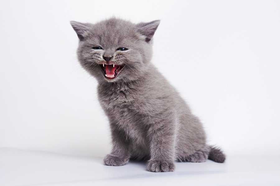 Котята рождаются беззубыми и питаются молоком матери до появления первых зубов. Вначале прорезаются резцы, и происходит это в возрасте 1-2 недель. Затем через 3-4 недели появляются клыки и спустя 6-8 недель заканчивают прорезываться предкоренные зубы. У малышей нет коренных зубов. К 2 месяцам у котенка должно быть 26 молочных зуба. Они белее и тоньше, чем постоянные.