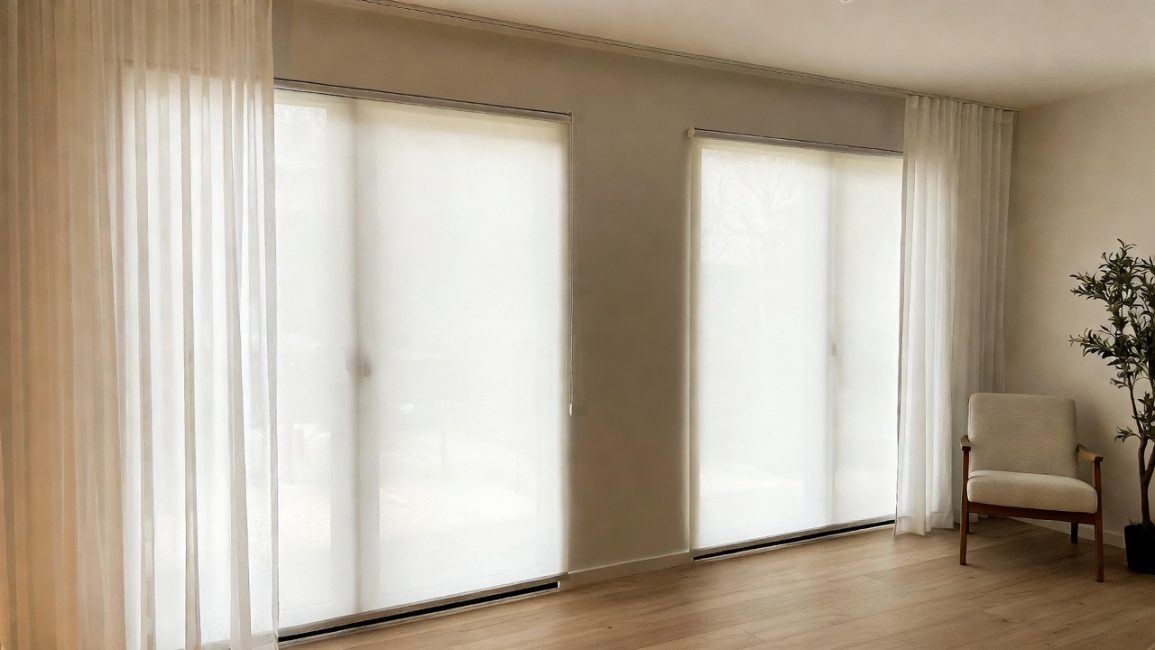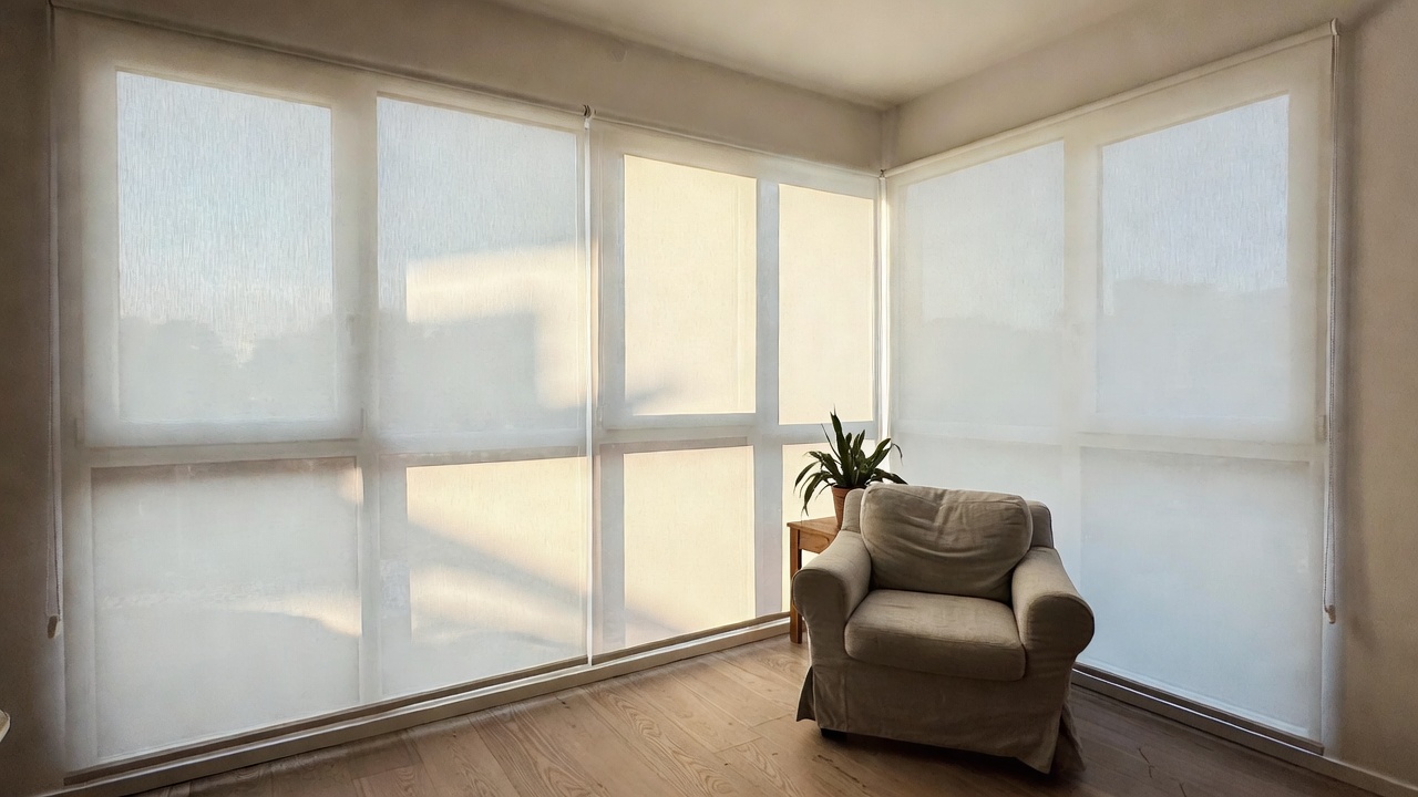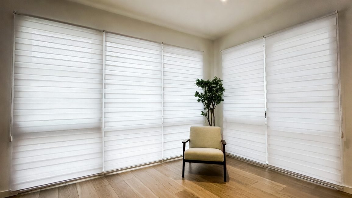 Для коммерческих и загородных объектов всё чаще выбирают зип-шторы — модели с боковыми направляющими, которые исключают световые щели по краям. Такие системы устанавливают на верандах, зимних садах и в офисах с угловым остеклением.