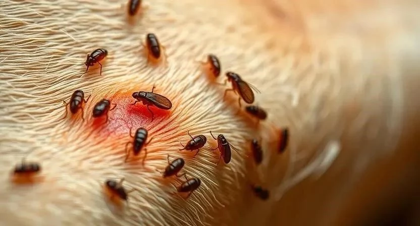 - Паразиты: Блохи, клещи, вши и чесоточные клещи вызывают зуд и раздражение кожи, что приводит к выпадению шерсти и воспалению.